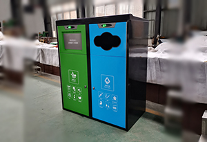 垃圾箱通過不同投放口進(jìn)行垃圾分類引導(dǎo),內(nèi)部設(shè)有壓縮系統(tǒng),用箱頂?shù)奶柲茈姵匕骞╇?可自動(dòng)對(duì)投入的垃圾進(jìn)行壓縮。